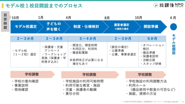 アフタースクールを展開する際は、行政側の制度検討や運営者側にとっても見守りの観点や利用児童等の変更点があるため、まずは、モデル校を開設し、制度や仕様の改善を加えて数校ずつ展開することをおすすめしています。モデル校の開設までのプロセス例についても参考として紹介しました。