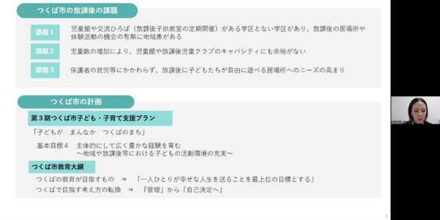 事例発表として、茨城県つくば市 こども部こども育成課の渡辺典江さんより、2025年度から開始された「つくば市アフタースクール事業」について、事業内容や導入後の変化、課題が共有されました 。