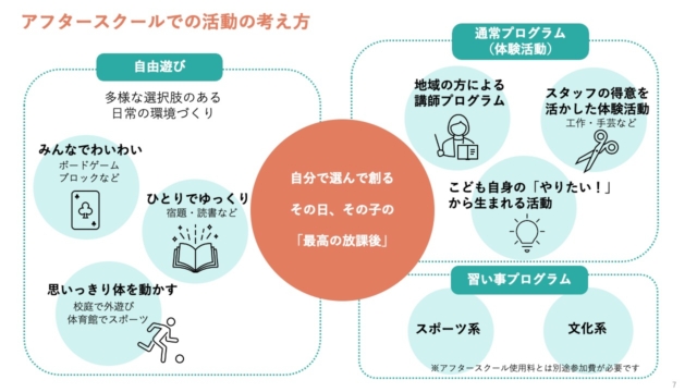 まず、目指す放課後の居場所として、「子どもが自分で過ごし方を選べる、『行きたい』居場所」であることを最も重視。これを実現できるモデルを「アフタースクール」と総称している点が説明されました。