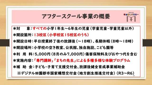 アフタースクール事業は、従来の放課後児童健全育成事業(学童保育)と放課後子供教室を融合させ、全ての児童を対象とし、子どもたちが「学ぶ楽しさを知り、なりたい自分を見つけること」を目的としています。特徴としては、放課後の時間に多様な体験プログラムを提供する点や、プログラムの講師として「まちの先生」と呼ぶ地域の人材を活用する点があります。2019年に放課後NPOアフタースクールの運営支援を受け、1校でのモデル事業からスタートし、現在は13校区で開設しています。