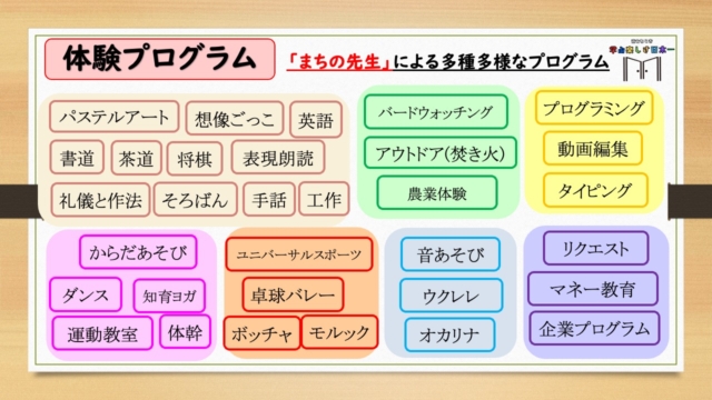 事業は、「誰もが参加できる」「多様な体験・活動がある」「地域みんなで見守る」を3つの柱とし、「児童自らが『好き』や『得意』を見つけ、自主的にやりたいことを選択できる放課後の居場所づくり」を最も大切にして進めています 。