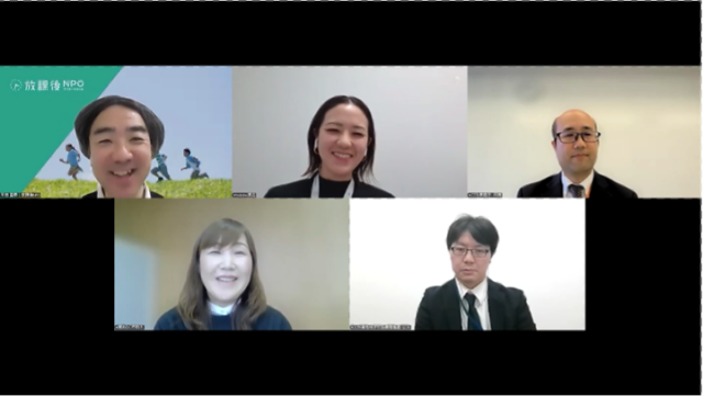 パネルディスカッションでは、事例発表を行ったつくば市の渡辺典江さん、南あわじ市の柏木映理子さんに加え、こども家庭庁成育局成育環境課の阿南健太郎さん、文部科学省 総合教育政策局 地域学習推進課 地域学校協働推進室の山本悟さんにも参加いただき、放課後NPOアフタースクール 平岩国泰がファシリテーターを務めて進行しました。