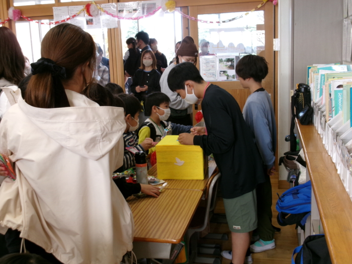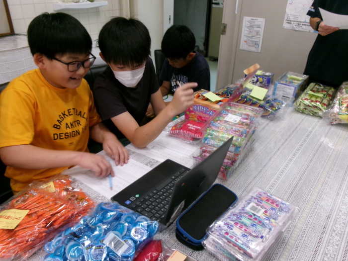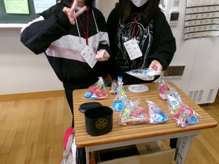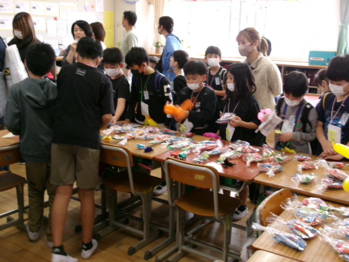 駄菓子に定価をつけ、100円の組み合わせを作って販売することとしました。「このセットは酸っぱいお菓子がそろっているね」「この組み合わせは人気があるからすぐ売れそうだよ」などと話し合いながら、楽しそうに作業を進めていました。当日は、教室に飾り付けをしたり、おまけをつけたりと、それぞれ工夫しながら、1組、2組で一店舗ずつ店を開きましたが、あっという間に300個以上が売れました。